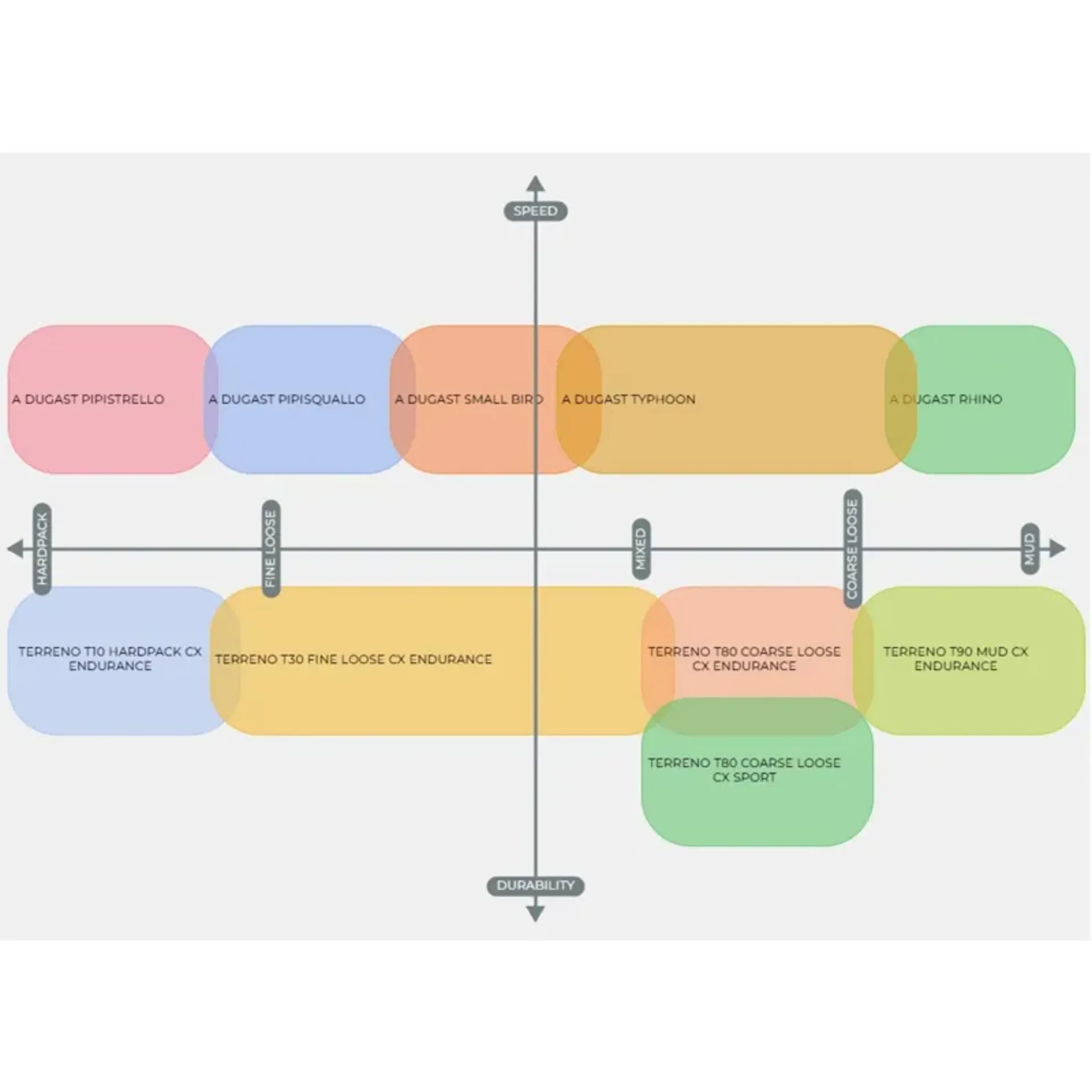 With a T-score of 10, the Terreno T10 is ideal for riders who spend most of their time on pavement or hardpacked gravel but want a tyre that can handle occasional detours with confidence. Optimized for efficiency on firm surfaces, the T10 rolls effortlessly while maintaining essential grip for real-world gravel riding, making it the go-to choice for events with mixed sections or fast endurance rides.